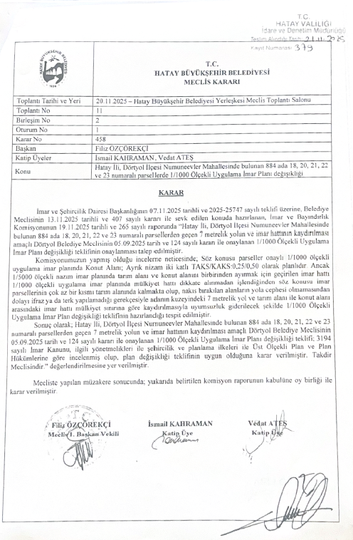BÜYÜKŞEHİR BELEDİYE MECLİSİNİN 20.11.2025 TARİH VE 458 SAYILI KARARI İLE